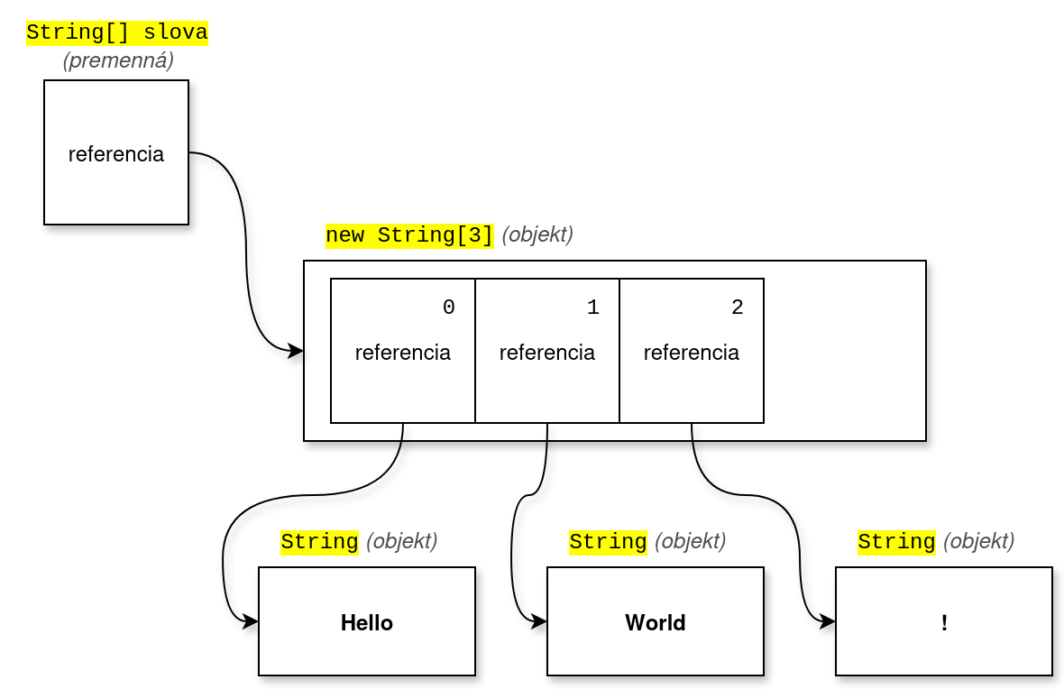 Ak mám pole primitívnych hodnôt, tak sú uložené priamo v objekte poľa. Ak mám však pole neprimitívnych hodnôt - objektov, tak do objektu poľa sa uložia referencie na objekty. V nasledujúcom príklade si pomocou diagramu znázorníme, ako to vyzerá v pamäti počítača: