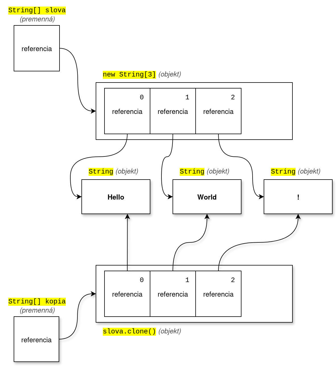 sa do neho skopírujú, ale samotné prvky sú iba obyčajná kópia ako pri =. To znamená, že keď máme pole objektov, tak sa nám skopírujú referencie. Vo výsledku budem mať 2 rozdielne polia, ale prvky v nich budú ukazovať na rovnaké objekty. To môže byť problém, ak sú objekty meniteľné.