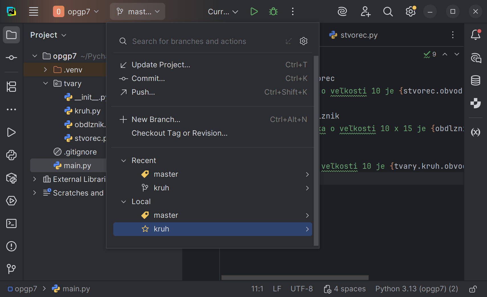 Nástroj PyCharm automaticky detekuje git repozitár a umožňuje nám robiť väčšinu operácií bez použitia príkazového riadku. Hlavné menu pre správu verzií je vľavo hore. Pomocou neho sa vieme prepínať medzi vetvami.