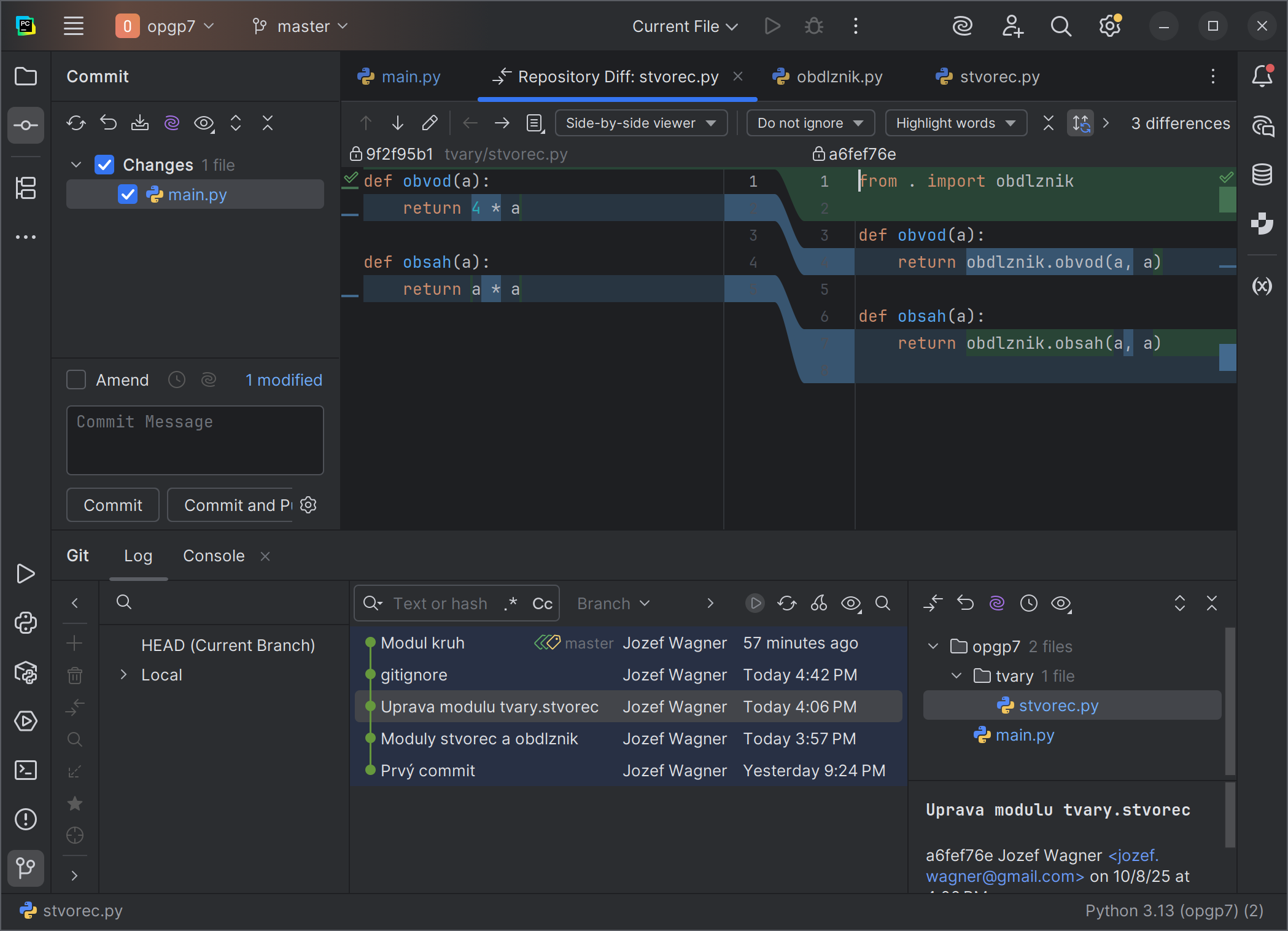 Akúkoľvek zmenu, ktorú sme nezapísali do commitu PyCharm detekuje a súbor so zmenou v projektovom okne v ľavom stĺpci označí modrou farbou. Červenou farbou označí súbory, ktoré nie sú pridané do repozitára.