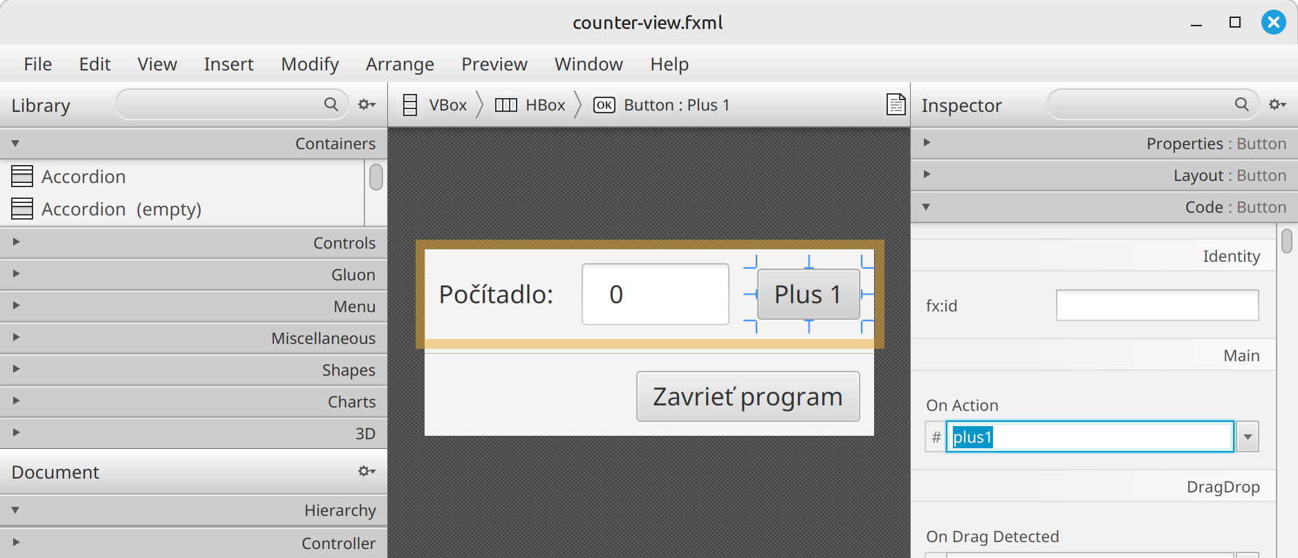 Ak užívateľ klikne na tlačidlo "Plus 1", aplikácia vyšle udalosť ACTION, ktorej cieľom je ovládací prvok Button.