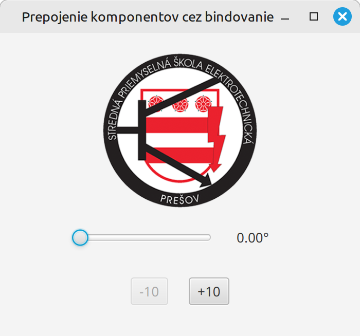 Upravíme si náš príklad, aby pomocou prepojení fungoval aj label. Okrem toho si ešte skúsime ošetriť tlačidlá +10 a -10 tak, aby boli zablokované, keď je slider na maximálnej alebo minimálnej hodnote. Vo finálnej verzii využijeme tieto property:
