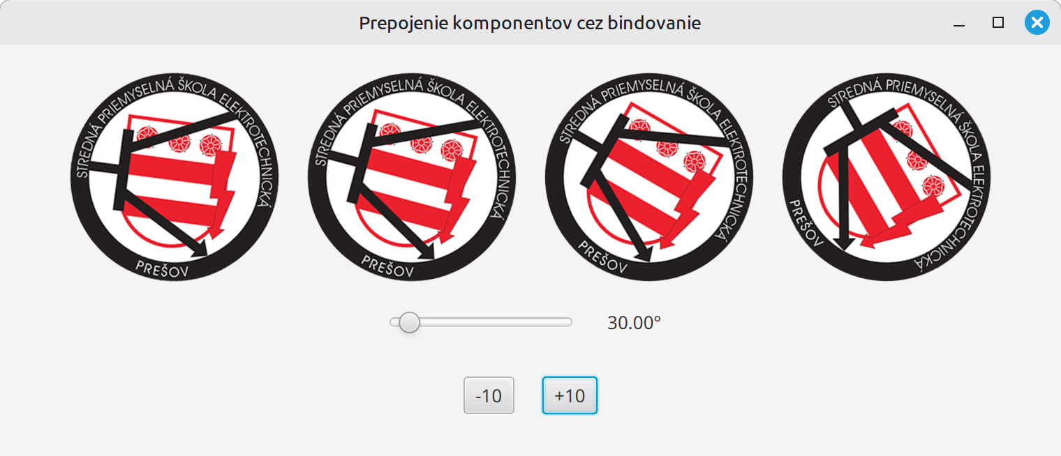 Na transformáciu property si ukážeme ešte jeden príklad. Zmeníme našu aplikáciu tak, aby v nej boli 4 logá školy, a každé aby sa otáčalo podľa hodnoty slidera. Chceme však, aby sa otáčali rôzne: Jedno logo by pri maximálnej hodnote slidera urobilo celú otočku (360 stupňov), druhé len pol, a iné 2 otočky.